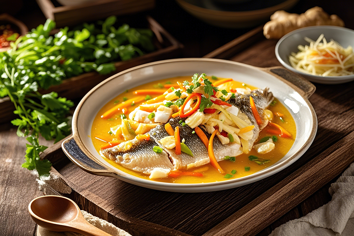1、一条600g的鲈鱼,杀好洗净(也可以让菜场大叔帮忙处理一下)。去头留用,取鱼身两侧鱼肉。 2、去腹部鱼刺后片成鱼片。1根春笋去壳切成笋片,150g火腿(或者咸五花)切成薄片。 3、煮一锅沸水,中火放入笋片30秒焯水捞出。 4、再煮一锅沸水,中火放入咸五花片和一勺料酒,煮10分钟捞出 5、鱼头放盘子一侧,后按照一片鱼片、一片笋片、一片咸五花的顺序,将盘子摆满。 6、盘中淋一勺料酒,放上2片姜片,1小把小葱段。沸水上锅,中火蒸5分钟,关火后再焖2分钟。 7、蒸鱼的时候做酱汁:锅中1/2勺食用油,中火油热后加入3个干葱头、1小把葱段、3片姜片,煸炒1分钟后,加入1勺蒸鱼豉油,2勺清水煮沸即可。 8、取出盘子倒掉盘中汤汁,撒上葱丝,再淋上酱汁。最后淋上2勺热油即可。