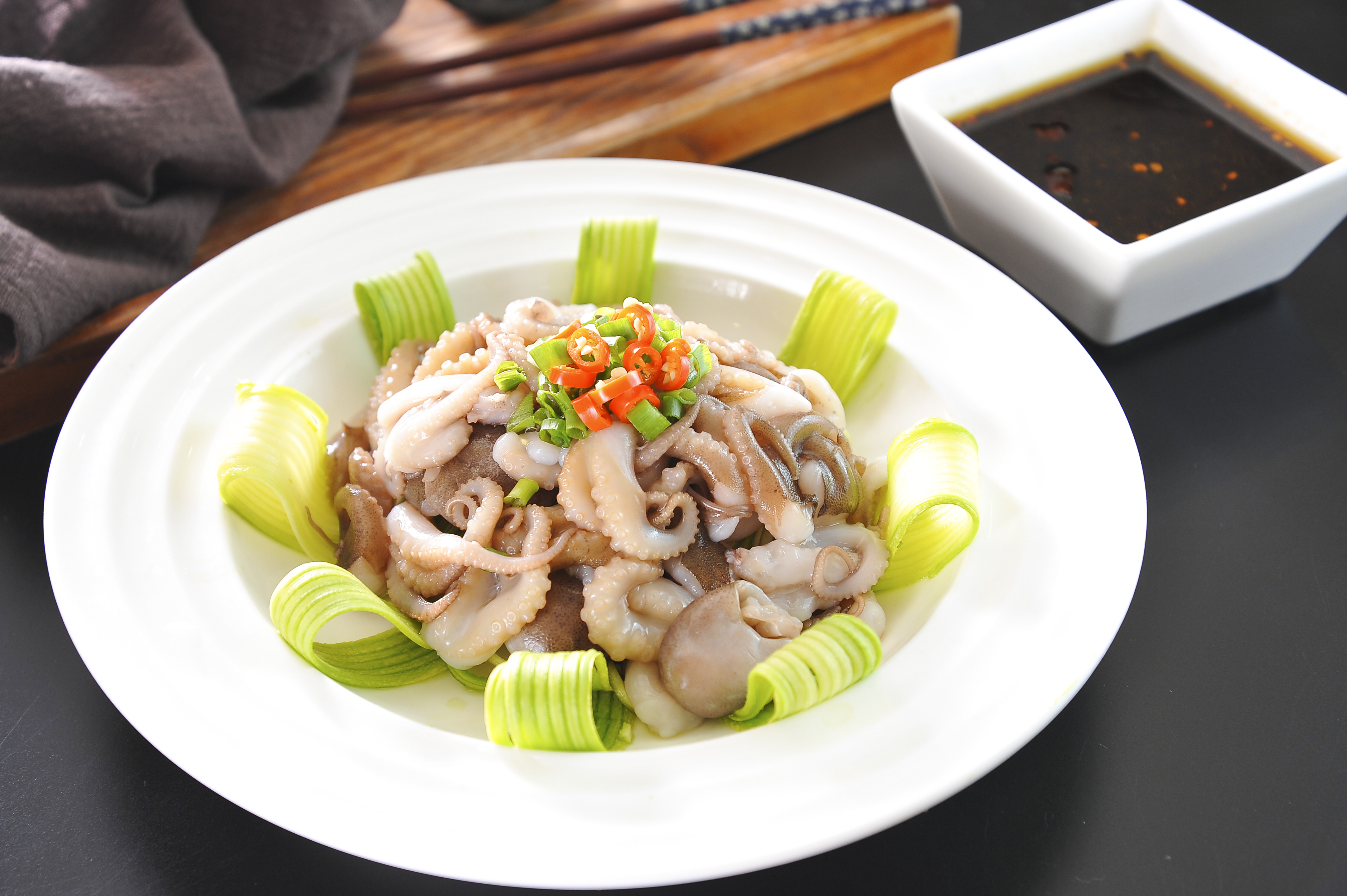 1353浏览量2025-06-10 11:00:03笔管鱿鱼500g、小葱1根、姜片适量、料酒适量、小米辣适量、香菜适量、柠檬适量、风味捞汁160g